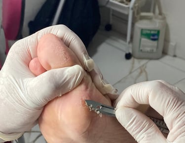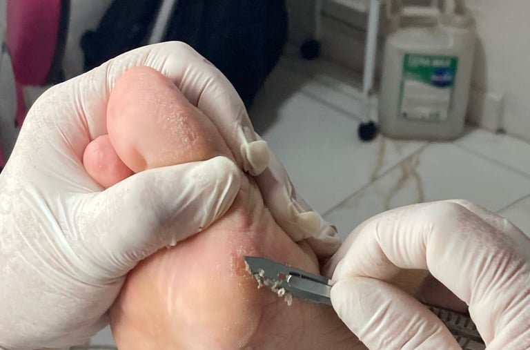 CAUSADO POR ACÚMULO DE QUERATINA, CAUSANDO FERIDAS E PERIGO PARA DIABÉTICOS.